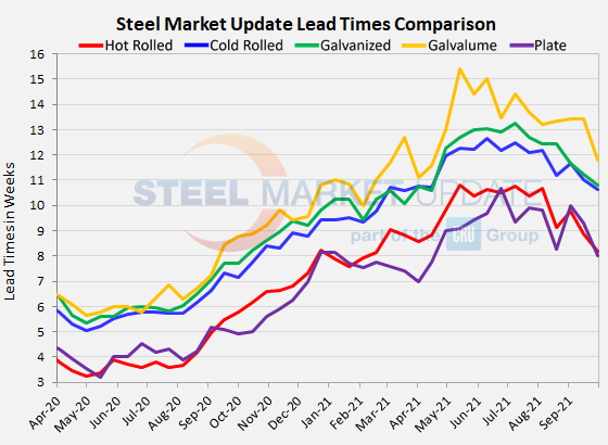 Buyers polled by SMU this week reported mill lead times ranging from 5-10 weeks for hot rolled, 7-14 weeks for cold rolled, 8-14 weeks for galvanized, 10-14 weeks for Galvalume, and 6-10 weeks for plate.
