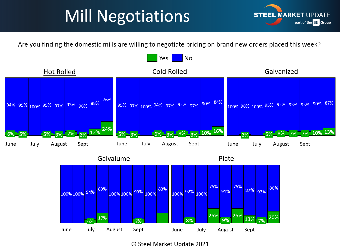 The month of September saw a notable change in the tone of price negotiations for hot rolled steel, suggesting that buyers may finally be winning some concessions from the mills. SMU asks buyers every two weeks if the mills are willing to talk price on spot orders. In SMU’s poll of the market in early September, just 2% of the respondents said mills were open to negotiating prices on hot rolled. By this week that figure had jumped to 24% – the highest percentage in nearly a year. The numbers are similar for cold rolled and coated products, where 13-17% of buyers now report mills opening up to price discussions. In plate, the figure is 20%. A significant change from the single-digit percentages of the past 10 months. The mills clearly still have the stronger bargaining position, but they may be feeling the pressure from imports and buyers who have replenished their inventories and are content to sit on the sidelines for a bit to see if steel prices moderate.
