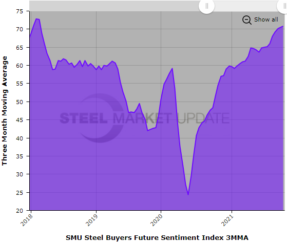 Steel Market Update polls service center and manufacturing executives every two weeks and asks how they view their chances of success in the near and longer term. SMU’s Current Buyers Sentiment Index moved up five points to a reading of +83 on Sept. 30, a single point below its all-time high set on Sept. 2, suggesting buyers have never felt better about their opportunities. No doubt that has much to do with steel prices, which remain near historical highs.