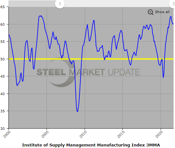 Below is a graph showing the history of the ISM Manufacturing Index. You will need to view the graph on our website to use its interactive features; you can do so by clicking here. If you need assistance logging into or navigating the website, please contact us at info@SteelMarketUpdate.com.