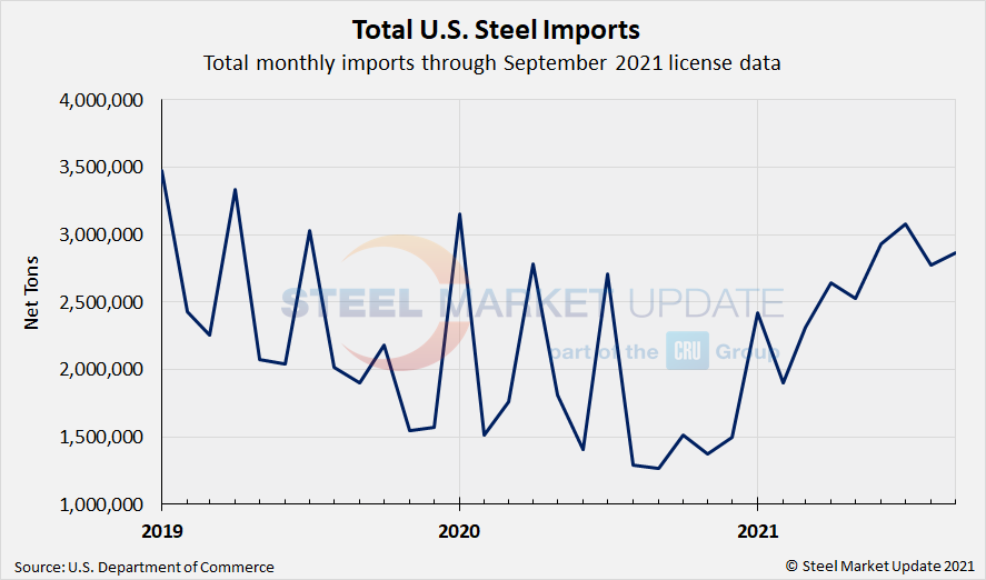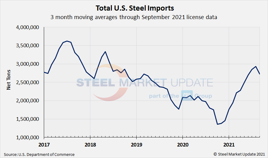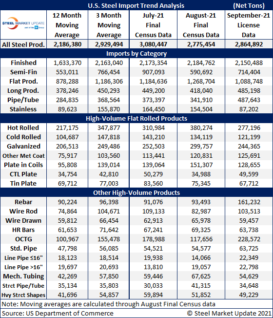 Due to large month-to-month swings in semifinished imports, the chart below shows total monthly imports on a three-month moving average (3MMA) basis in an attempt to more accurately display U.S. steel import trends. The 3MMA through final August data is 2.93 million tons, up from 2.85 million tons in July and up from 2.70 million tons in June. August marks the highest 3MMA import level seen since June 2018 when it was 3.06 million tons. The lowest 3MMA level in our recent history was October 2020 at 1.36 million tons. Looking at September license data, the September 3MMA is currently a 2.72 million tons.