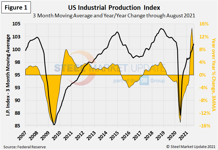 Data on U.S. industrial production, capacity utilization, new orders and inventories continued to improve through August, indicating a strengthening manufacturing sector. The health of the manufacturing economy has a direct bearing on the health of the steel industry. Note that some of the historical data below has been adjusted by the U.S. Census Bureau and Federal Reserve, with some revisions going back as far as the mid-2000s.