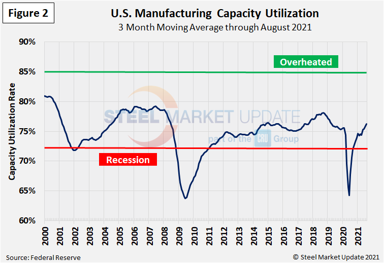 Manufacturing capacity utilization through August was measured at 76.2% as a 3MMA, the 10th consecutive month above recessionary territory, and the highest 3MMA rate recorded since March 2019. The rate had hovered around 75% for most of the 2010’s, but began to decline in April 2020 and reached a low of 64% in June 2020 (Figure 2).