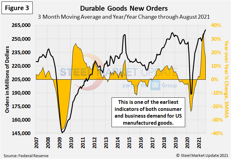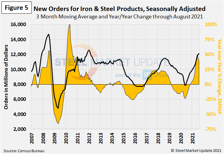 Within the Census Bureau M3 manufacturing survey is a subsection for iron and steel products. Figure 5 shows the history of new orders for iron and steel products since 2007 as a 3MMA. The 3MMA year-over-year growth rate, which reached negative 23.4% last May, has climbed to a positive 39.0% as of August at $12.1 billion (3MMA). This is the highest new order level seen since February 2012. Back in June 2021, the 3MMA year-over-year growth rate reached a multi-year high of 49.6%, the highest rate since July 2010.
