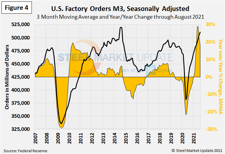 The growth rate of new orders for manufactured products as reported by the Census Bureau was slightly negative for most of 2019, then declined sharply from March to July 2020 (Figure 4). On a 3MMA basis, factory orders have increased each month since then, reaching $510 billion in August 2021. This is up 18.1% compared to one year prior, the highest 3MMA level seen since September 2014.