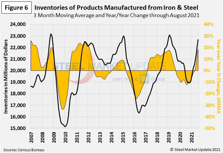 Inventories of iron and steel products broke their multi-month decline streak in November 2020, and have risen each month since. The latest iron and steel inventory levels totaled $22.7 billion on a 3MMA basis in August, up 18.6% compared to the same period the year prior (Figure 6). This is now the highest 3MMA measure since March 2019, and the highest year-over-year change seen since February 2012.