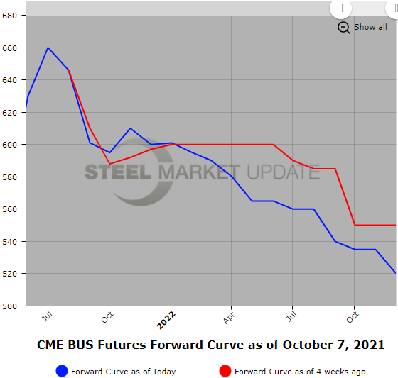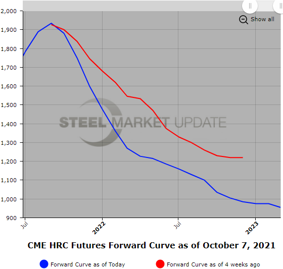 The hot rolled futures market was interesting this week as a strong reported decline in spot HR prices surprised many. The weekly HR index the CME uses to calculate the monthly index dropped $45/ST ($1,913/ST) this past week surpassing the entire HR price gain for the weekly indexes in September. Meanwhile, the forward curve settlements have not yet completely reflected the drop in spot in the near date forward months even as the backward steepness of the monthly curve increased in the mid-2022 quarters. The Q4’21 HR average for Sept. 29 settle to the Oct. 7 settle only declined by $5/ST due to the Dec’21 futures increasing almost $25/ST. The Q1’22 HR average for the same dates only declined $7/ST due to an $18/ST rise in Jan’22 HR settle to settle. Trading volumes remain healthy with almost 8,200 HR contracts traded in the last week. Open interest declined just over 5,500 contracts as the September month rolled off and has since added just under 1,000 contracts leaving it at almost 37,100 contracts.