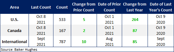 The number of active U.S. rigs rose by 5 to 533 rigs, with oil rigs up 5, gas rigs unchanged, and miscellaneous rigs unchanged. Compared to this time last year, this week’s count is up 264 rigs, with oil rigs up 240, gas rigs up 26, and miscellaneous rigs down 2. See the first graph below for a history of active U.S. rig counts.