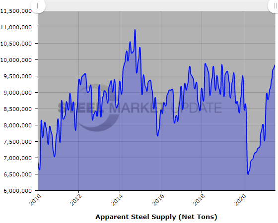 To see an interactive graphic of our Apparent Steel Supply history (example shown below), visit the Apparent Steel Supply page in the Analysis section of the SMU website. If you need any assistance logging into or navigating the website, contact us at info@SteelMarketUpdate.com.