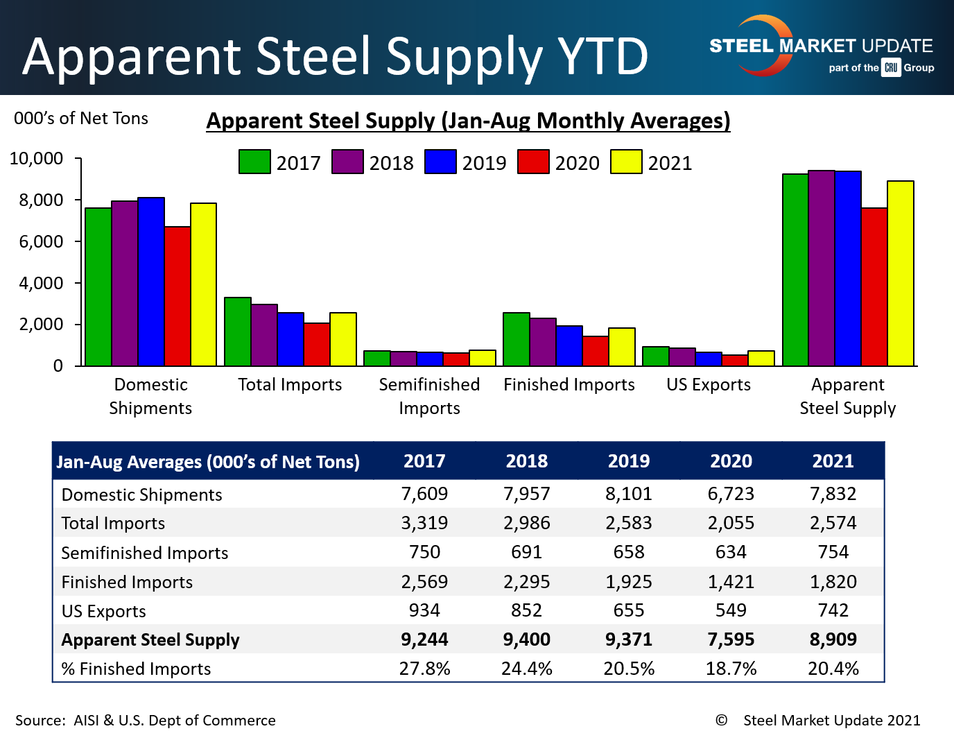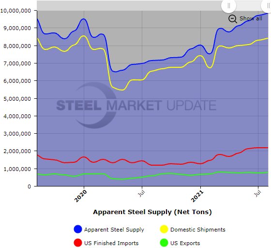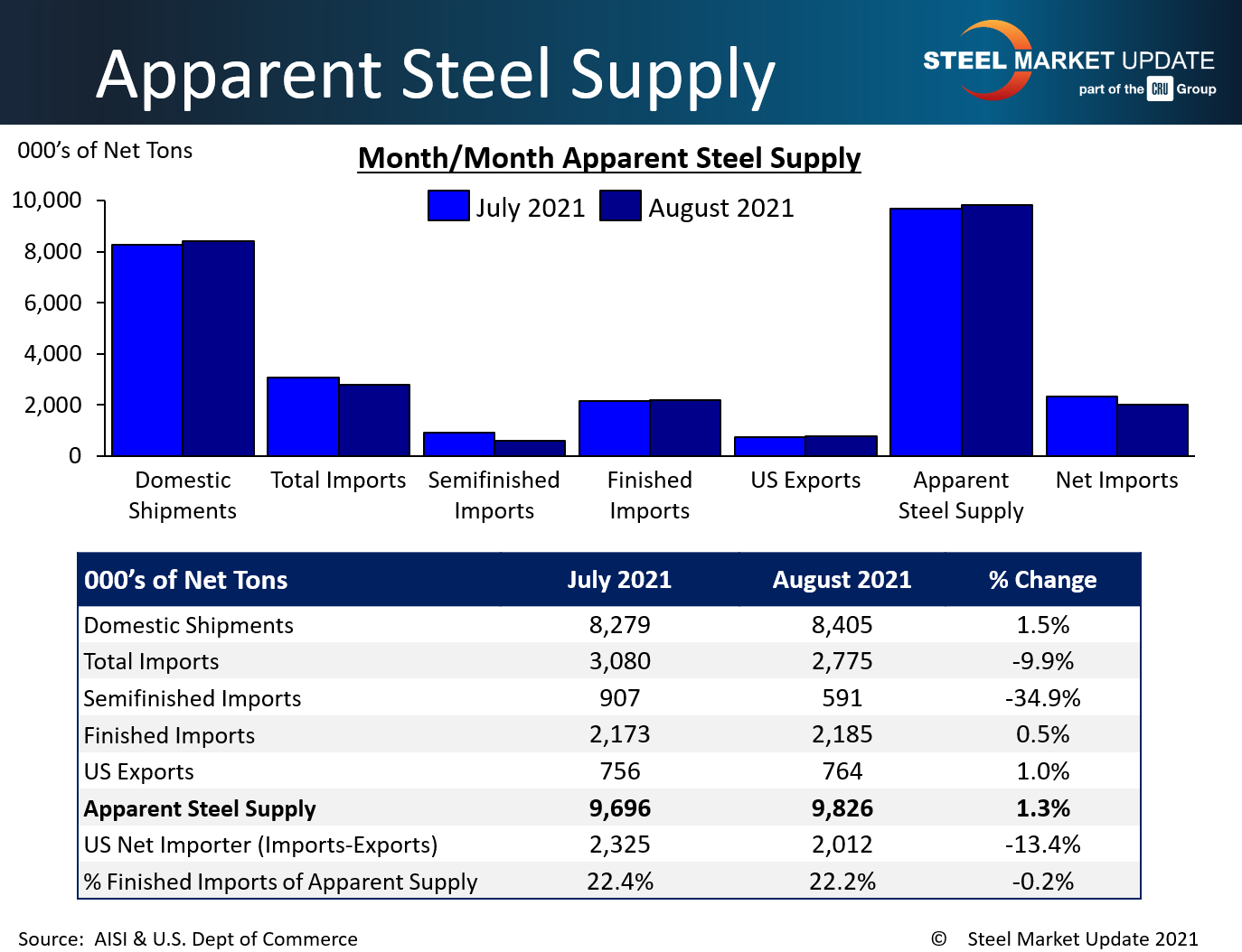 August apparent steel supply increased by 130,000 tons over July to 9.83 million net tons, according to the latest U.S. Department of Commerce and American Iron and Steel Institute data. This is the highest supply level seen since January 2019, a 31-month record. August supply is up 2.69 million tons compared to the same month one year ago.