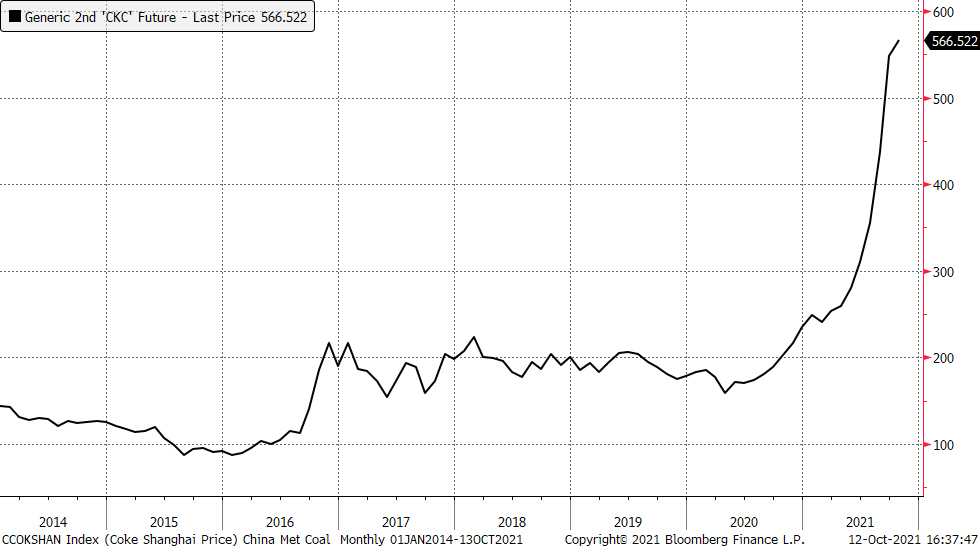 Understandably the headlines are geared to the factors that impact the broader economy, but when you dive deeper into the factors impacting steel production they are just as stark. Several recent reports have highlighted the severity of energy shortages in places like China and Europe and the subsequent impact on steel production. Bloomberg reported that one of the biggest zinc producers, Nyrstar, in Europe will cut output at three smelters by up to 50% due to rising power prices and cost burdens associated with tighter environmental regulations. Spanish specialty steelmaker Sidenor announced it was reducing production by 30% between now and the end of the year due to onerous power costs they estimate have risen by 400% over the course of the year. We shared a similar graph a few weeks ago, but the below graph of metallurgical coal prices in China continues to rise and has quietly become the most expensive input required to make steel via the blast furnace process. Looking at estimates provided by the World Steel Association, 89% of blast furnace energy inputs come from coal, 7% from electricity and 3% from natural gas, versus EAF producers who obtain 11% of their energy input from coal, 50% from electricity and 38% from natural gas. The broader economic energy headlines, when paired with these estimates, suggest increasing energy costs will add further cost to steel production should these rising trends persist. Steel production is a very energy intensive endeavor, and these impacts could prove important for determining where steel prices may be headed.