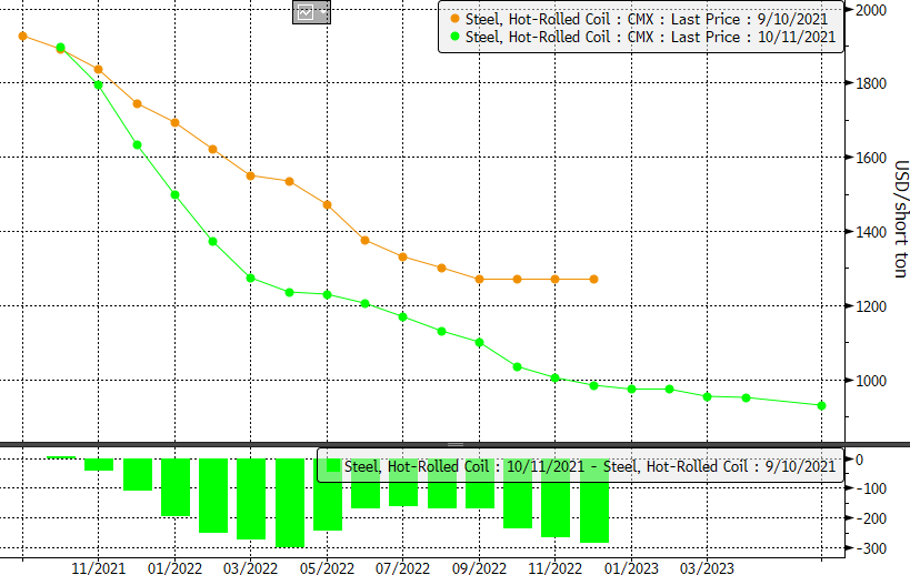 Despite the above chart illustrating that overall selling pressure has pushed the futures curve meaningfully lower month over month, we may be storing a fair amount of potential energy in the futures market that could have been the result of waiting for some sort of clarity to develop on contract discussions for 2022. It seems that the landscape around supply/contractual agreements is coming into clearer focus lately, which could unleash a flurry of activity now that mills, service centers, fabricators and OEMs have greater confidence on what to expect from a volume and floating price perspective. Further, buyers may begin to look to the forward curve to lock in fixed forward costs significantly lower than current spot levels.