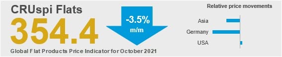 After 14 consecutive months of rising global sheet prices, CRU’s Global Flat Products Steel Price Indicator (CRUspi flats) has fallen m/m. This indicator fell 3.5% as sheet prices continue to fall across most regional markets.