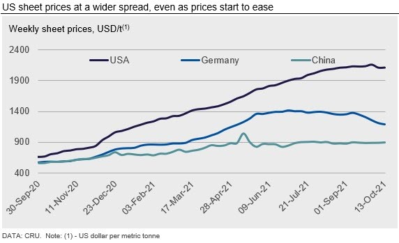 In China, price volatility remains a prominent issue as daily sheet prices quickly picked up after the National Day holiday, yet earlier this week they eased, somewhat. The government continues to strictly enforce steel production cuts and now with the worsening energy shortage, we are picking up evidence of lower demand for sheet due to the recent power rationing. This issue of significantly higher energy costs has also affected the European market. However, while some mills are now instituting an energy surcharge, we are seeing base sheet prices fall at a quicker pace.