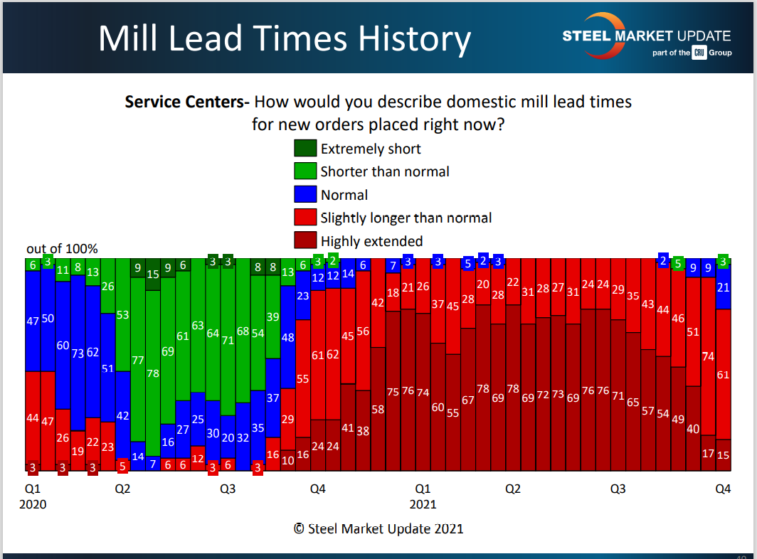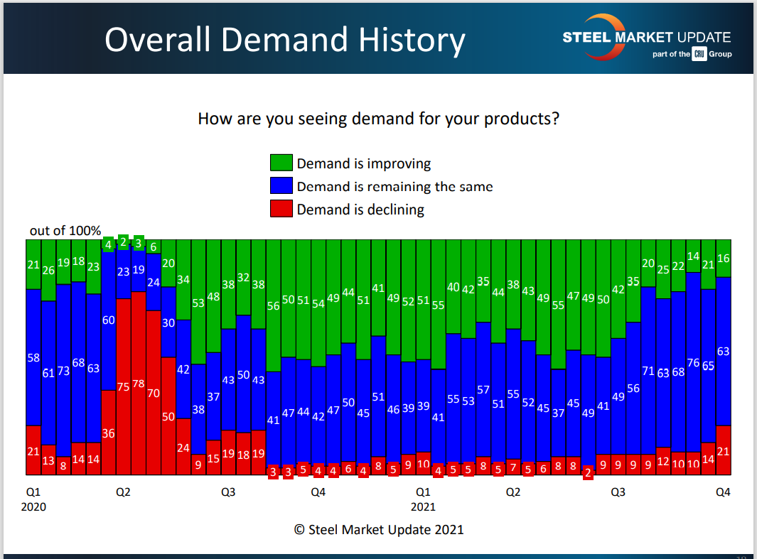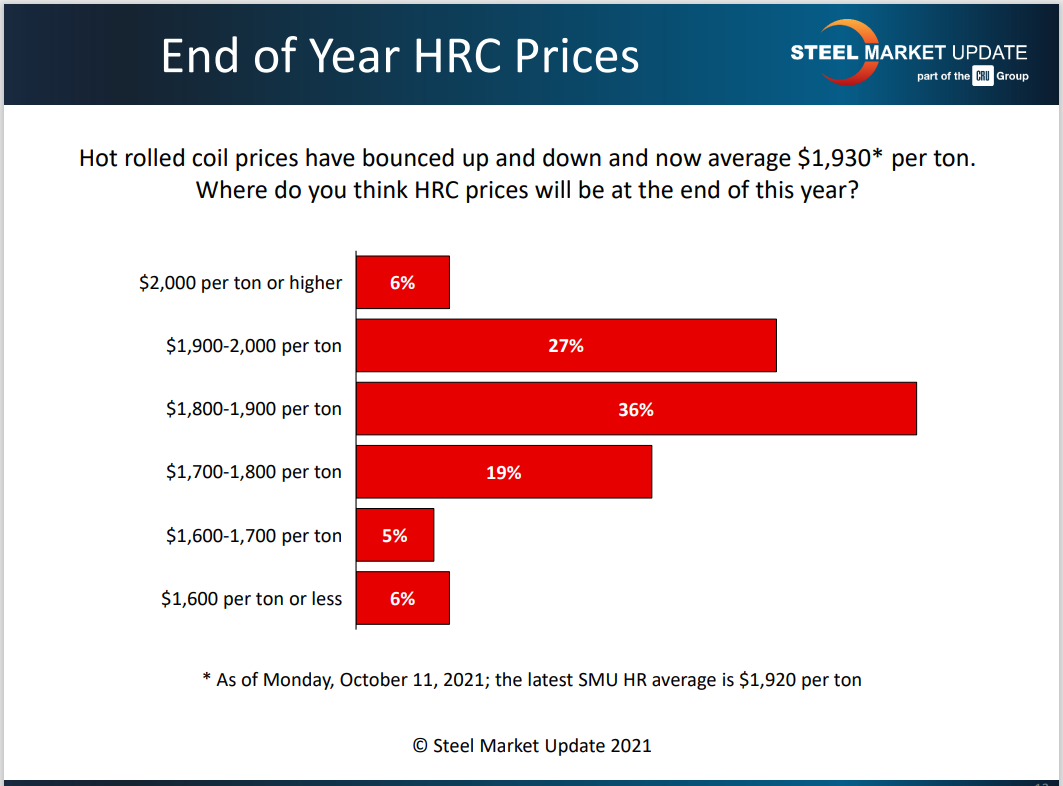 Several respondents commented on the microchip shortage and its dampening effect on automotive demand. Others noted that “concern about declining prices might put some buyers on the sidelines” as they postpone purchases in anticipation of cheaper steel down the road. There may also be some seasonality at work as the year nears its end.