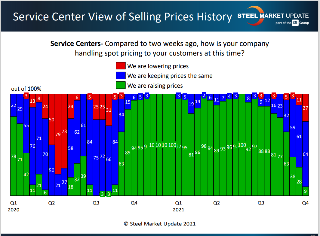 It’s hard for most service center executives to feel any urgent concern about declining steel prices as long as demand seems so strong. But there are signs in Steel Market Update’s survey data this week that suggest demand is moderating. With prices likely to follow.