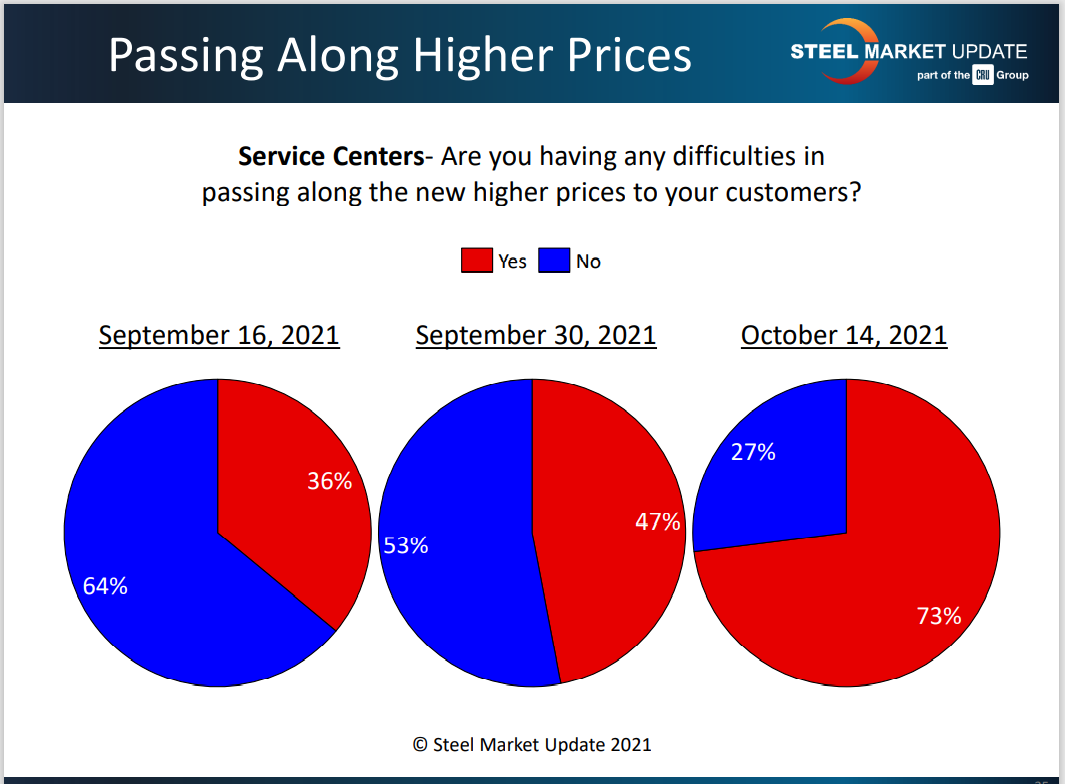 Another sign of softening demand is growing price sensitivity among steel end-users. More service centers say they are finding it difficult to pass along higher steel prices to their customers (see chart below).