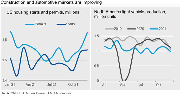 Investments in North American steel galvanizing capacity are a major boost to zinc demand. CRU’s steel team forecast that North American galvanized sheet production will increase by nearly 11% y/y in 2022, putting it more than 9% above the 2018 high.