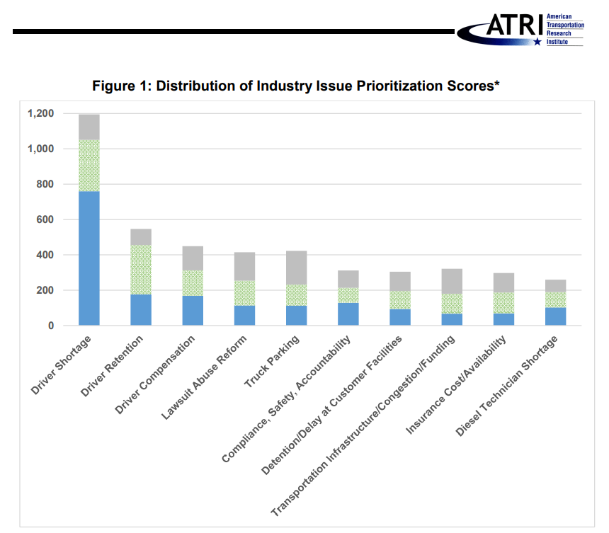 For the fifth year in a row, the driver shortage topped the list of trucking industry concerns, as ranked by the American Transportation Research Institute in its 17th annual Top Industry Issues report released this week. The driver shortage garnered more than four times as many first-place votes as the number two issue, driver retention. Further reflecting the industry’s workforce challenges, driver compensation was ranked third overall.