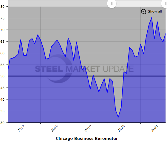 Below is a graph showing the history of the Chicago Business Barometer. You will need to view the graph on our website to use its interactive features; you can do so by clicking here. If you need assistance logging into or navigating the website, please contact us at info@SteelMarketUpdate.com.
