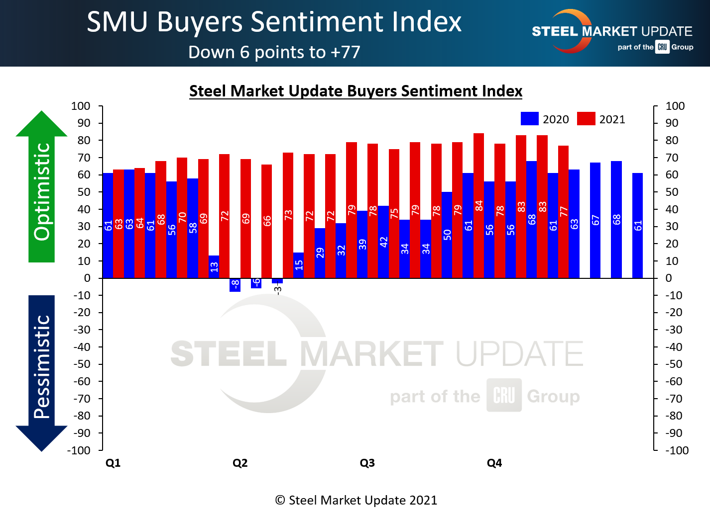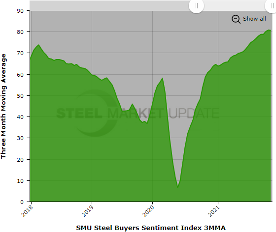SMU Steel Buyers Sentiment Index is a measurement of the current attitude of buyers and sellers of flat-rolled steel products in North America regarding how they feel about their company’s opportunity for success in today’s market. It is a proprietary product developed by Steel Market Update for the North American steel industry.