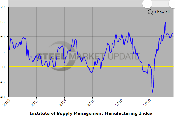 Below is a graph showing the history of the ISM Manufacturing Index. You will need to view the graph on our website to use its interactive features; you can do so by clicking here. If you need assistance logging into or navigating the website, please contact us at info@SteelMarketUpdate.com.