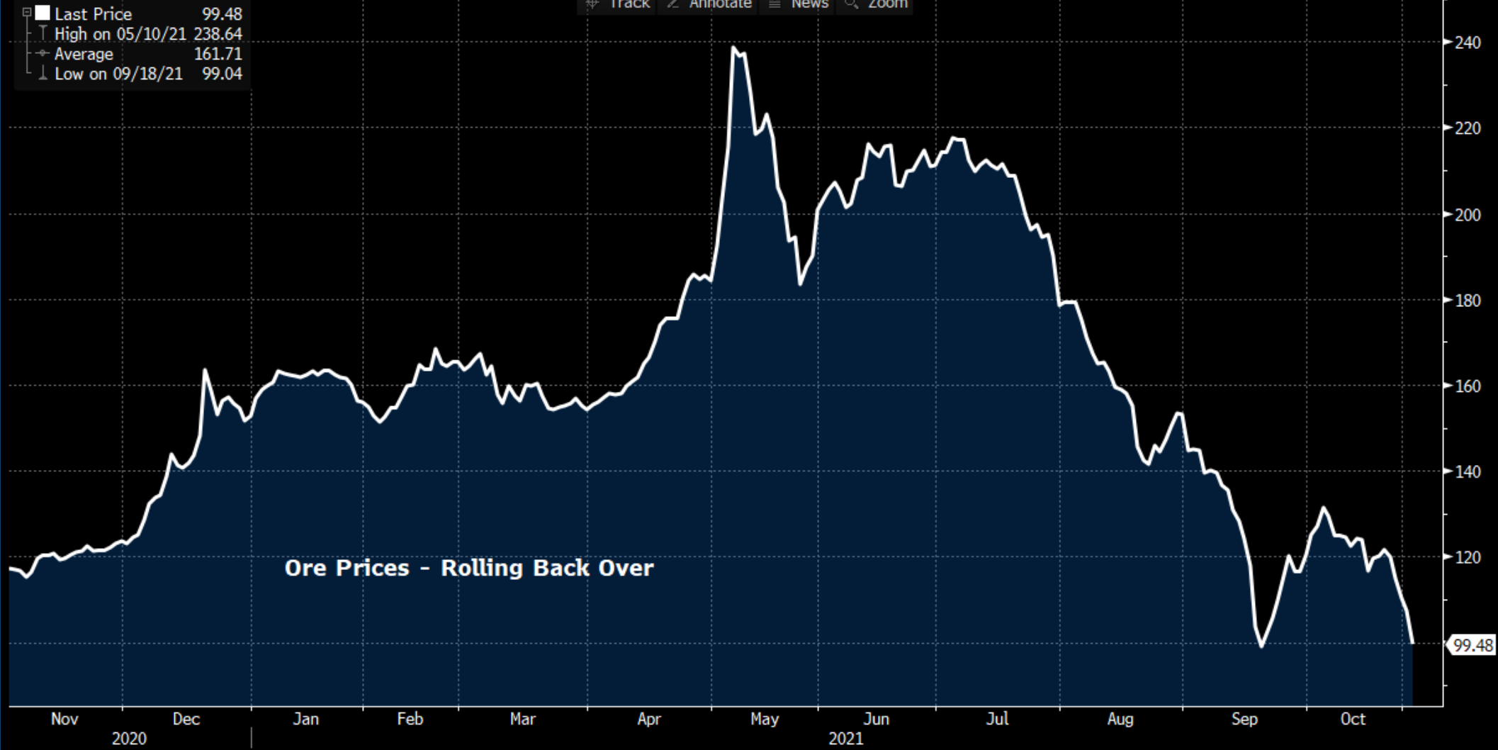 On that note, we’d also like to revisit China, where lower steel production continues to dominate the news. After a brief recovery rally, ore prices sold off again in recent trading sessions: