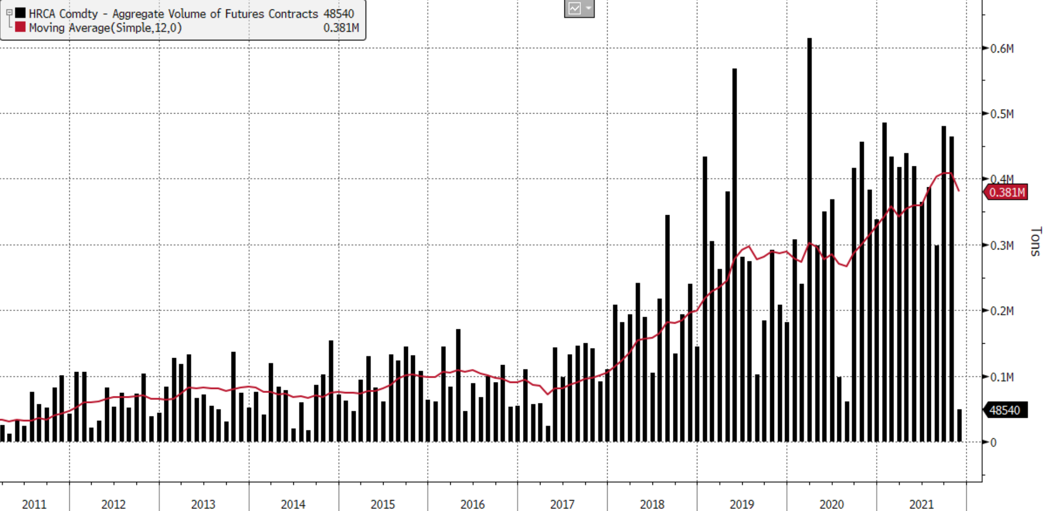 We will close with a word on volumes. The HRC contract in the U.S. continues to gain traction, and volumes in 2021 will likely be another record. The chart below shows the “cleared” volumes on the CME, but it is important to note that many tons also trade “OTC” or over the counter. These volumes are not counted in the below chart.