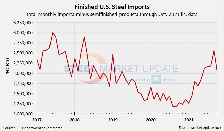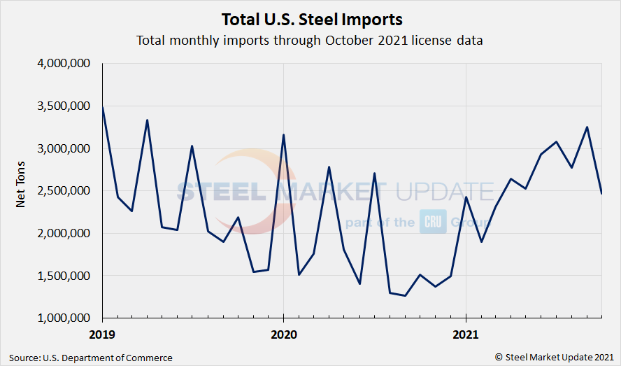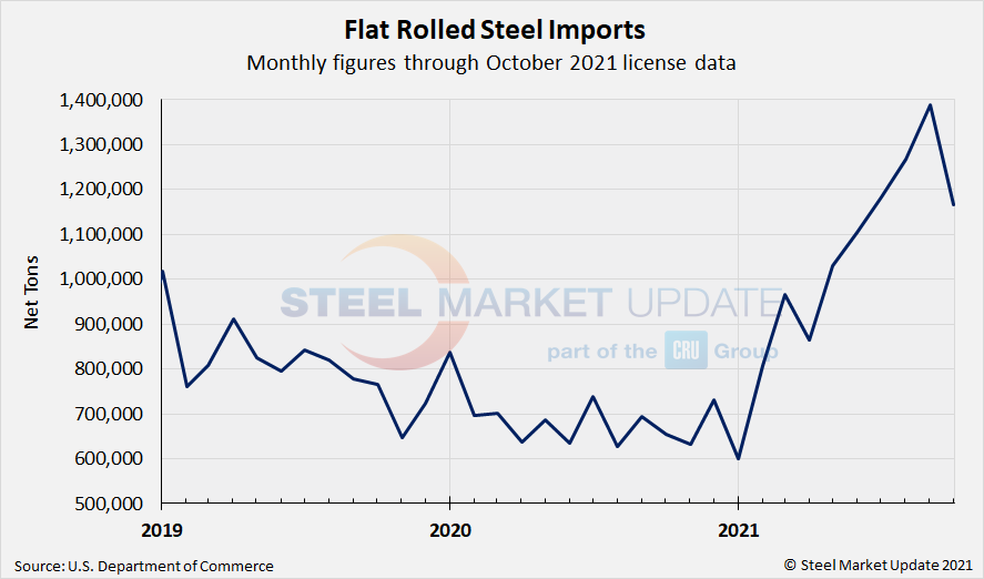 Final Census data shows that September foreign steel imports increased 17% from August to 3.26 million net tons and a 28-month high. October import licenses are currently at 2.47 million tons as of Nov. 4, down 24% from September and down 11% compared to August.