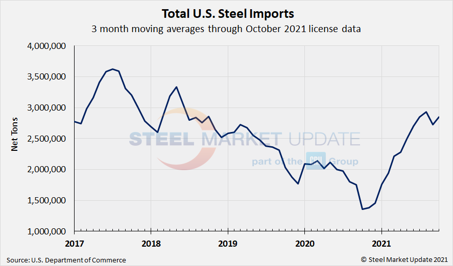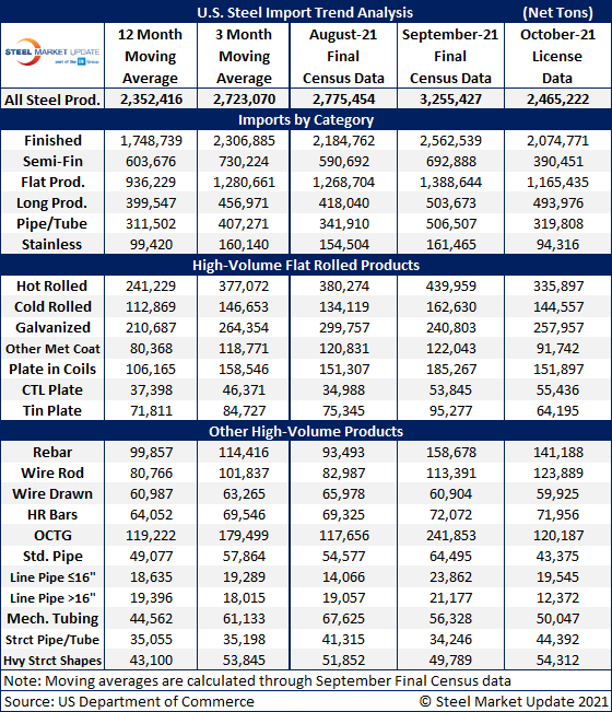 Due to large month-to-month swings in semifinished imports, the chart below shows total monthly imports on a three-month moving average (3MMA) basis in an attempt to more accurately display U.S. steel import trends. The 3MMA through final September data is 3.04 million tons, up from 2.92 million tons in August, and up from 2.85 million tons in July. September marks the highest 3MMA import level seen since June 2018 when it was 3.06 million tons. The lowest 3MMA level in our recent history was October 2020 at 1.36 million tons. Looking at October license data, the October 3MMA is currently at 2.83 million tons.