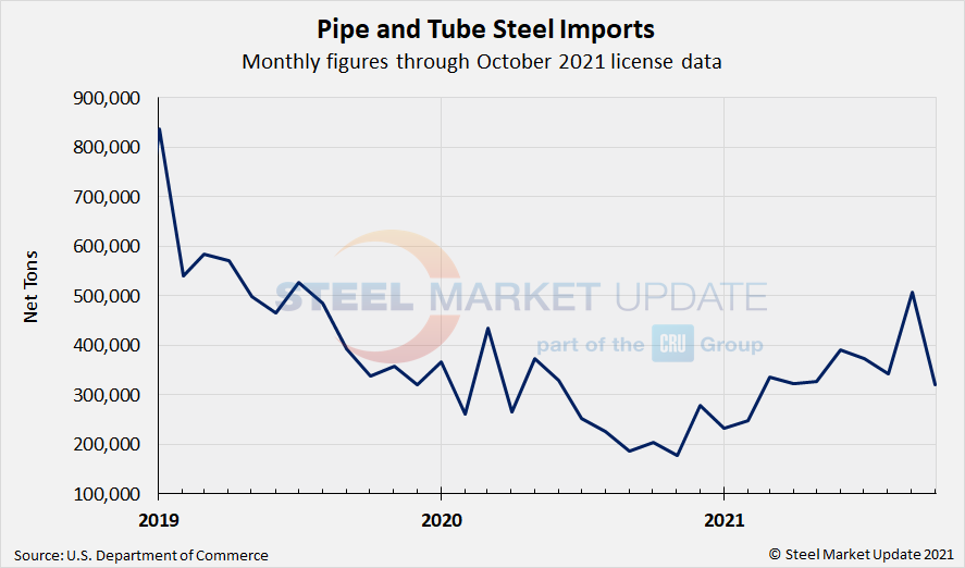 The two charts below show monthly imports grouped by product category: flat rolled imports and pipe and tube imports. Flat rolled imports rose to another multi-year high in September to 1.39 million tons, with the latest October license data showing 1.17 million tons coming into the country. Pipe and tube imports increased to 507,000 tons in September, a 25-month high, and October licenses are currently at 320,000 tons.