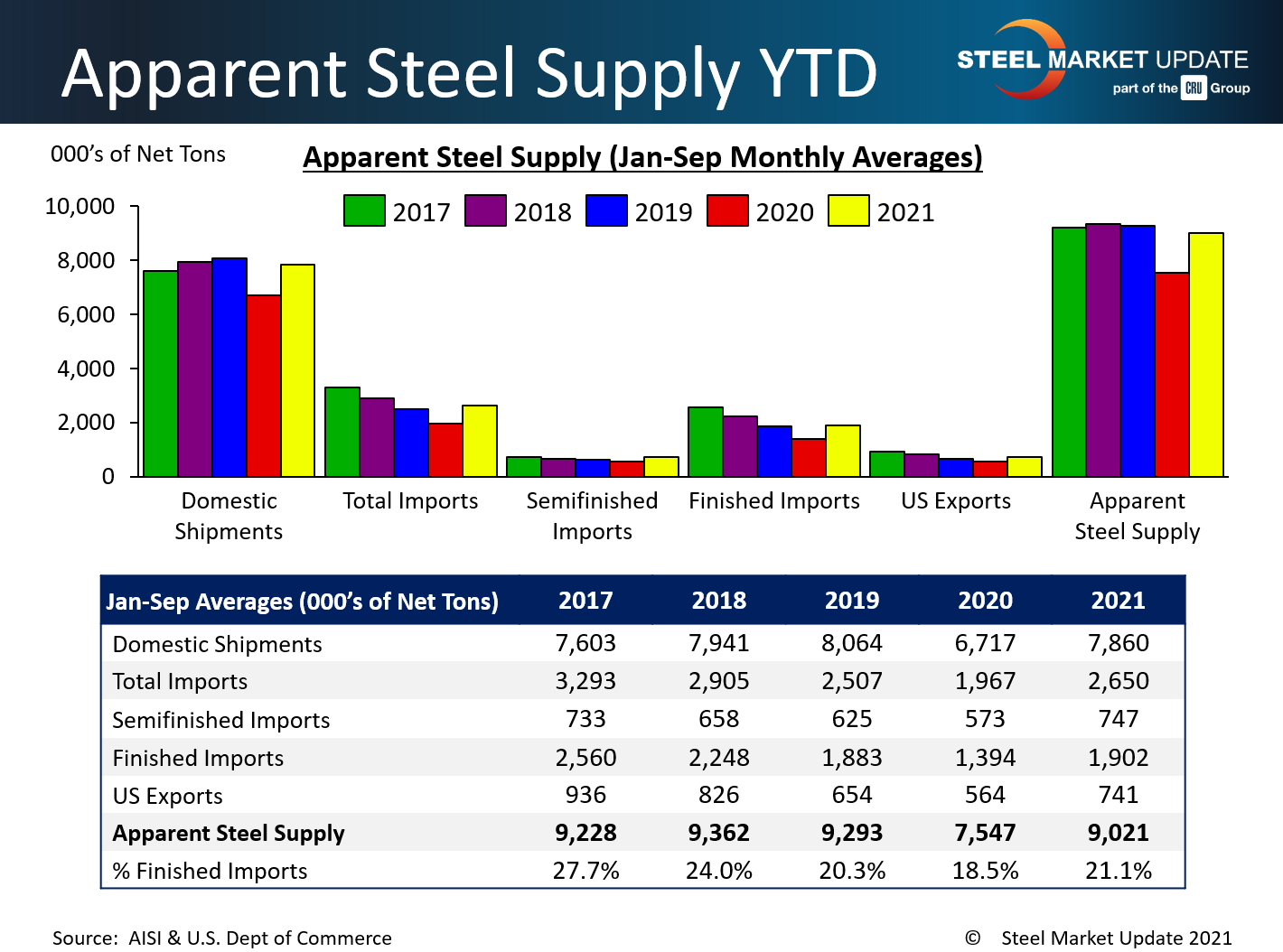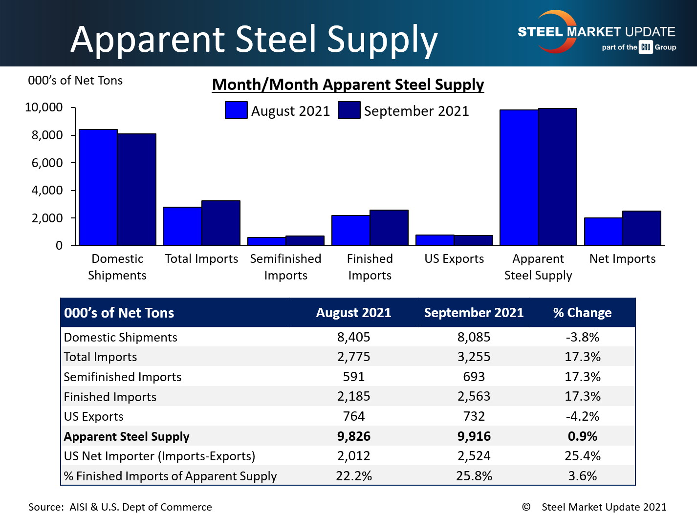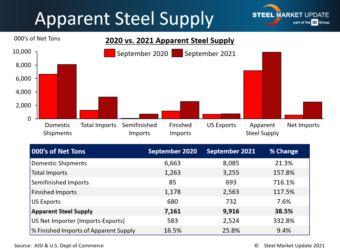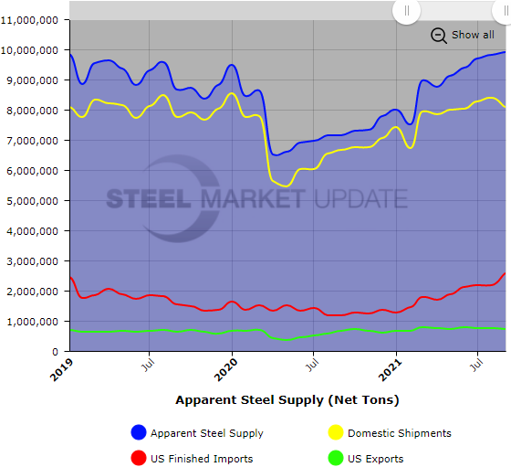 September apparent steel supply increased by 90,000 tons over August to 9.92 million net tons, according to the latest U.S. Department of Commerce and American Iron and Steel Institute data. This is the highest supply level seen in more than six years, going back to January 2015 when supply surpassed 10 million tons. September supply is up 2.76 million tons compared to the same month one year ago.