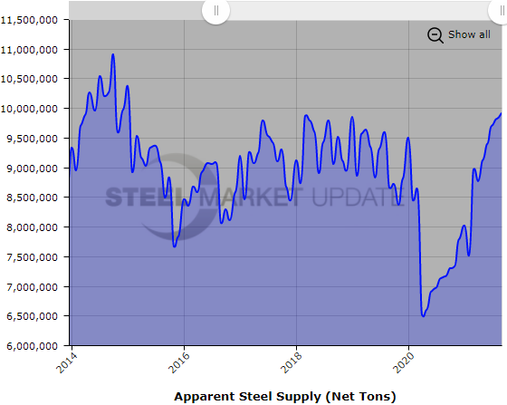 To see an interactive graphic of our Apparent Steel Supply history (example shown below), visit the Apparent Steel Supply page in the Analysis section of the SMU website. If you need any assistance logging into or navigating the website, contact us at info@SteelMarketUpdate.com.