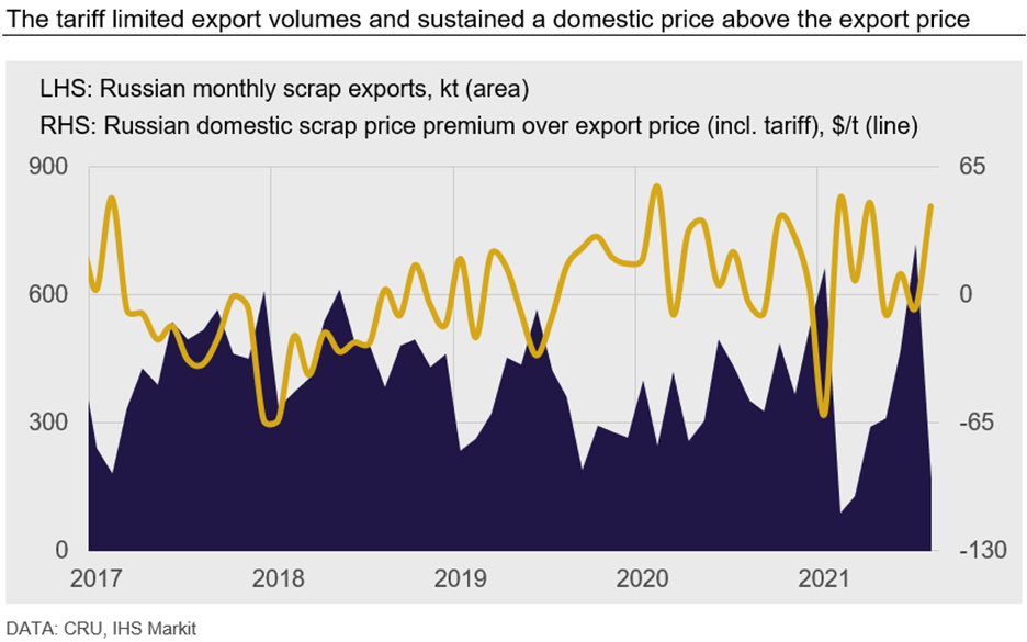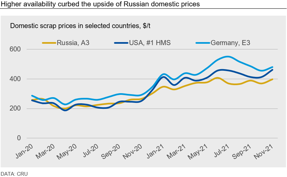 With the tariff increase and fewer attractive export options, more material stayed in the country, preventing Russian domestic scrap prices from rising as rapidly as prices in other markets. Local mills faced less competition from exporters and were able to set relatively lower purchasing prices, although the support coming from higher finished steel prices and bulk raw materials was also reflected in Russian scrap price versus 2020 levels.