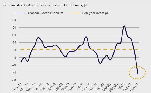 Domestic scrap demand should be solid again in December, although some mills may have overbought in November in anticipation of seasonally driven hurdles for scrap collection during winter. Moreover, there is little pressure from the export market, with deals done to Turkey down $10-20 from their peak in October, said CRU Senior Analyst Ryan McKinley.