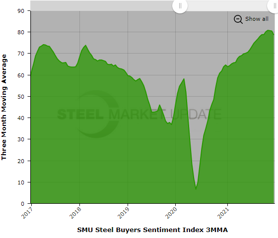 SMU Steel Buyers Sentiment Index is a measurement of the current attitude of buyers and sellers of flat-rolled steel products in North America regarding how they feel about their company’s opportunity for success in today’s market. It is a proprietary product developed by Steel Market Update for the North American steel industry.