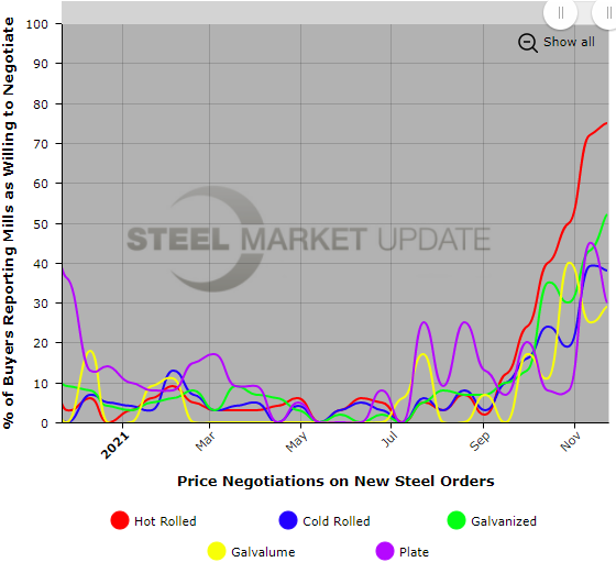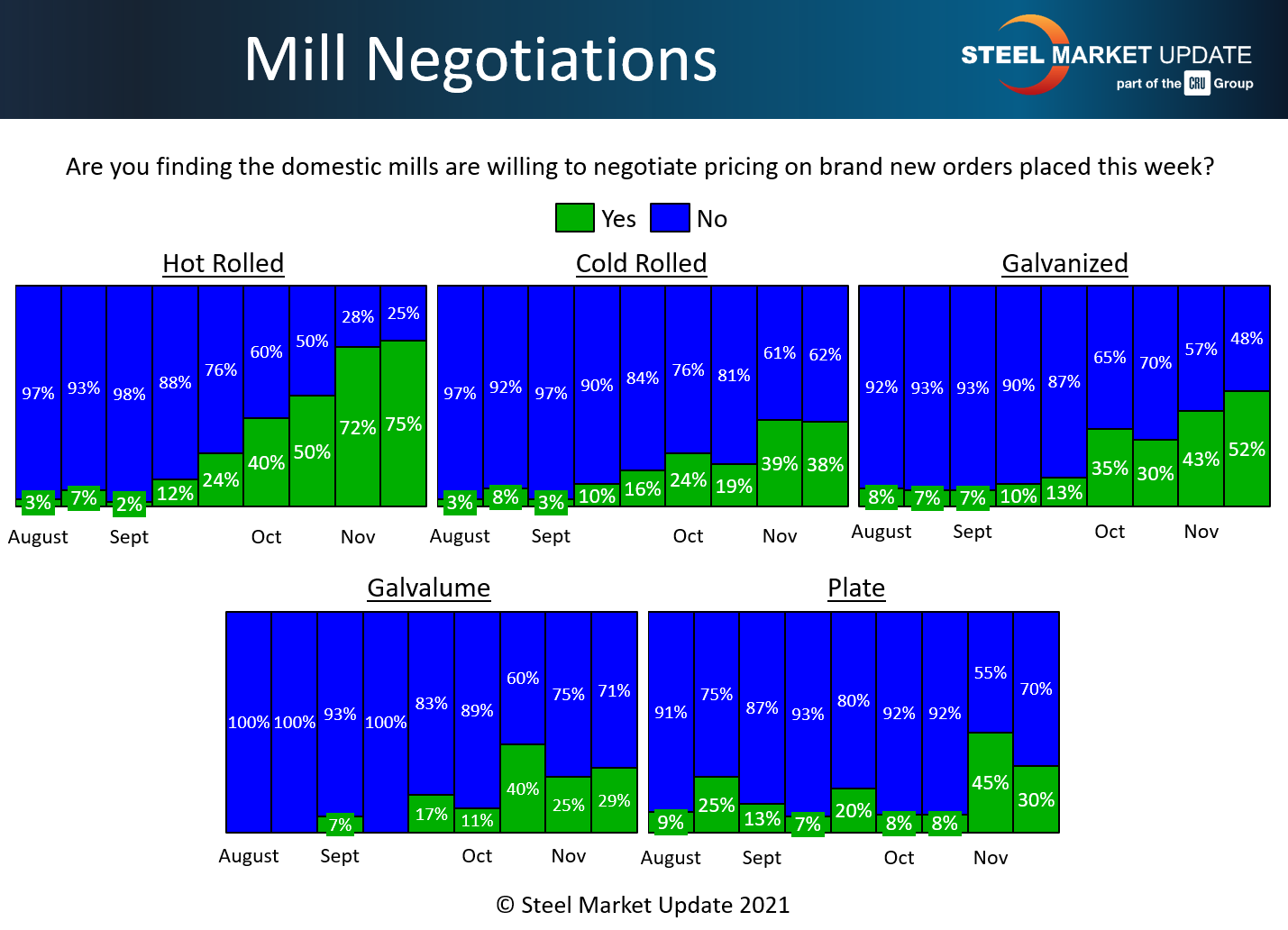 The percentage of galvanized respondents reporting mills willing to negotiate was 52%, up from 43% in our last survey. That marks the first time since August 2020, when the market hit bottom after the COVID-19 outbreak, that more than half of galvanized buyers reported mills willing to consider lower prices.