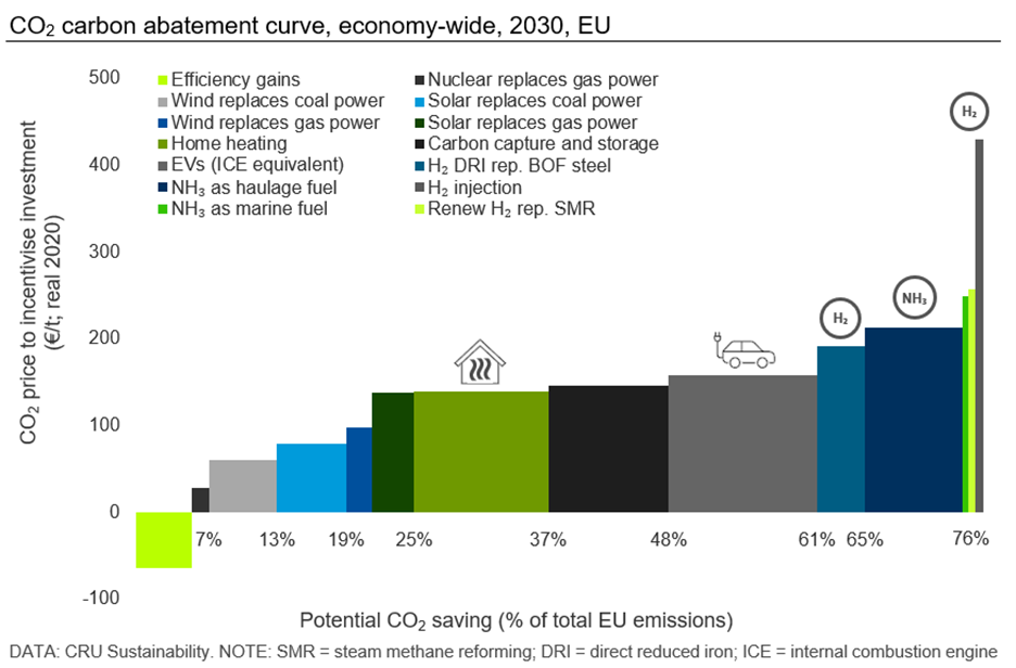 One way to do that is to increase the cost of high-CO2 options. CRU Sustainability has constructed a carbon abatement curve that sets out the CO2 cost necessary to incentivize transitioning to low-carbon technologies across various areas of the economy. As the CO2 emissions element of continuing to operate with existing polluting processes becomes more expensive, progressively more lower-emission processes become attractive as a substitute. There are many lower-emission processes that can be incentivized, including relatively “easy” and well-advanced ones such as wind or solar replacing coal power.