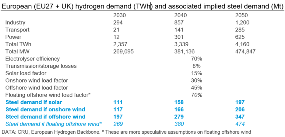 If the electricity is supplied by solar or wind it will be steel intensive. Our prior work on steel in renewables shows steel intensities of 35–45 t/MW in solar, 84 t/MW in onshore wind and 212 t/MW in offshore wind, which perhaps could double for floating offshore.