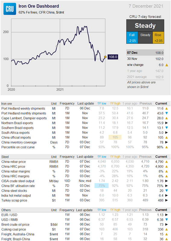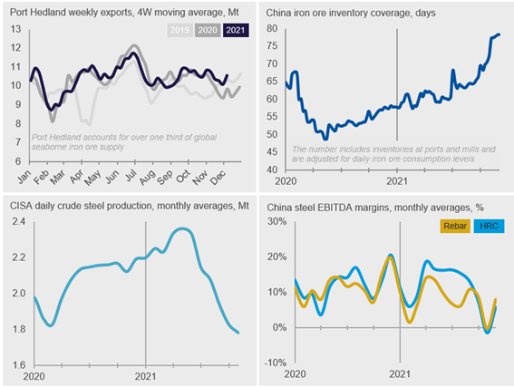 Supply has improved considerably in the past week, with strong shipments particularly at Port Hedland and in northern Brazil. Rio Tinto is also increasing shipments and the November exports from Cape Lambert and Dampier, the company’s two ports, showed a significant improvement from October. However, its low-grade SP10 product continues to make up a high proportion of exports. In southern Brazil, exports are falling mainly due to miners reducing exports of low-grade material as discounts are high. Another interesting development in the past week is China’s sharp rise in iron ore imports for November (see data below). In our view, this is not indicative of a sudden rise in Chinese demand, but rather the result of offloading activities at ports accelerating throughout Q4. Freight prices have increased after stabilizing at lower levels from historic peaks this year. Brent crude oil prices have reduced after the dramatic fall due to fears of the Covid-19 Omicron variant. India has been retracting from the international market, with both imports and exports reducing.