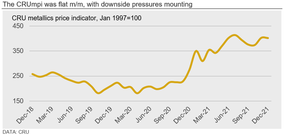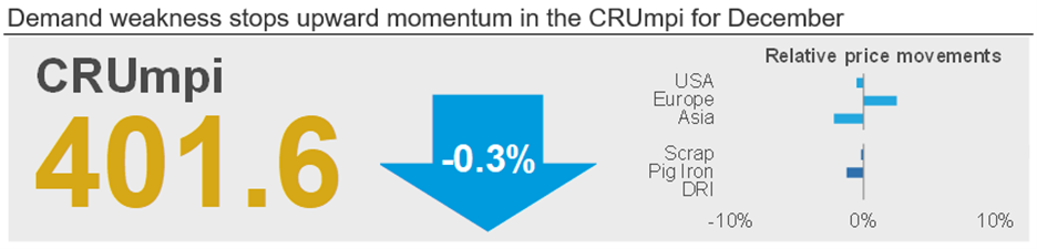 The CRU metallics price indicator (CRUmpi) was little changed m/m in December at 401.6 after expectations of another price increase for metallics were dampened by weaker-than-expected demand. Supply is becoming seasonally scarcer in some markets. But, in our view, weakness in finished steel markets is likely to put downward pressure on metallics prices heading into January.