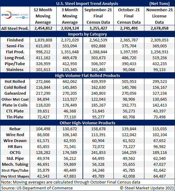 Due to large month-to-month swings in semifinished imports, the chart below shows total monthly imports on a three-month moving average (3MMA) basis in an attempt to more accurately display U.S. steel import trends. The 3MMA through final October data is 2.92 million tons, down from a 3+ year high of 3.04 million tons in September. Recall that the lowest 3MMA level in our recent history was October 2020 at 1.36 million tons. Looking at the latest November license data, that 3MMA is currently at 2.89 million tons.