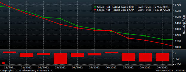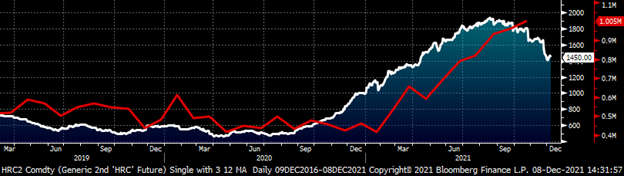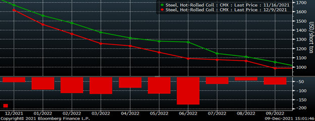 Chinese steel imports into the U.S. have been prevented by massive AD/CV duties, however, China’s price heavily influences global prices and can be used as a proxy for global import markets. This graph shows the (monthly) difference between Midwest and Chinese spot HR prices. This data point has been and will continue to be a reliable predictor for HR imports. Notice that the highs have remained above $1,100 over the last three months. This happened because the Chinese price has fallen at a rate similar to the Midwest HR spot price. This is the equivalent of a slow moving hurricane sitting on top of the domestic steel market that will continue to pound away until domestic mills pull out their foreign fighter marketing campaigns by abruptly slashing prices. The longer domestic prices stay elevated, the greater the damage will be in 2022.