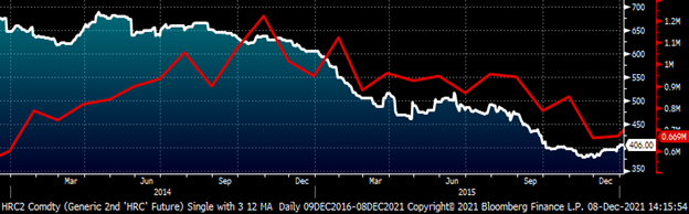 The last two years have been unlike any seen before. HR trading above $1,900 is all you need to know. Nevertheless, fundamentals will ultimately exert their forces clearing the market and bringing it back to equilibrium. That being said, it’s worthwhile looking for historical parallels as a guide to shape future expectations. The current market shares a number of characteristics with the 2014 market. In 2014, domestic mills had a number of supply issues constraining production, pushing out lead times, and driving up flat rolled prices. Buyers responded by placing orders with international suppliers and imports climbed all year long with flat rolled sheet peaking at 1.225 million short tons in October. Despite the surge of imports, HRC prices remained sticky in the fourth quarter falling only $40 from $640 to $600. Then a week or two into the new year, the 2015 bear market began taking HR first down to $450 and then eventually to $375 in November.