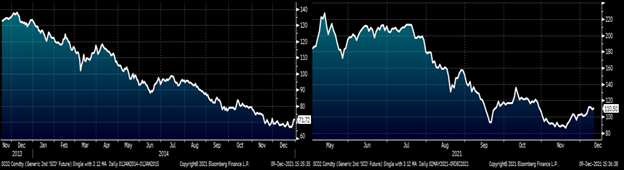 Another similarity between 2014 and the present was China struggling with economic growing pains. You might remember stories of ghost cities where Chinese developers built high rise buildings, shopping malls, etc. that were completely uninhabited and empty. Throughout 2014, iron ore collapses from $140 to $70. Throughout 2021, iron ore has also collapsed from $225 to as low as $90/t.