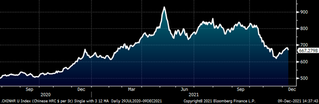 Chinese steel prices have rapidly declined as well with the January Chinese HR future falling from over $800/st in October to the low $600s a couple weeks ago, then rebounding and closing at $667 today.