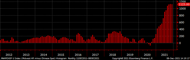 Midwest Spot HR Minus Chinese Spot HR $/st