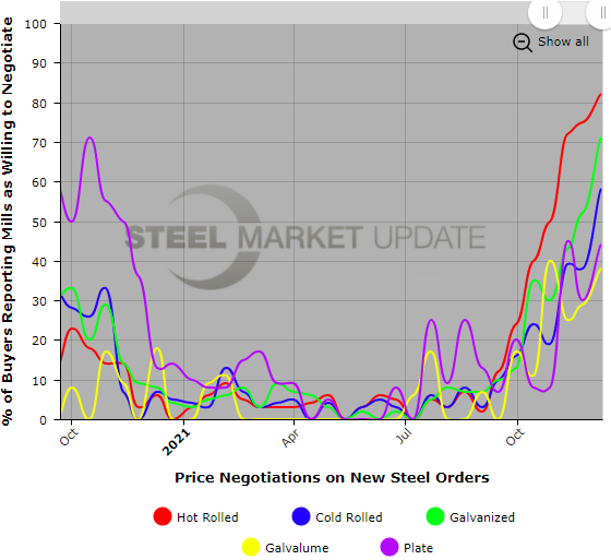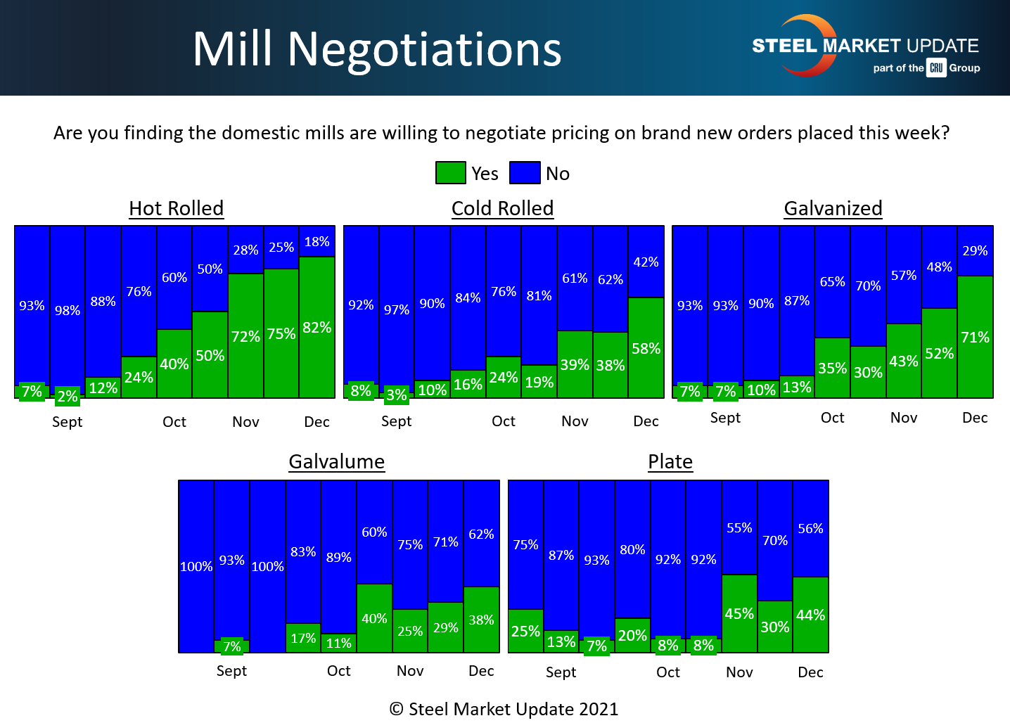 As recently as September, there was little or no negotiation taking place on most products as demand continued to outpace supplies – meaning mills could basically dictate the price. One has to search SMU data as far back as the buyers’ market of August 2020, when the economy was still emerging from the initial pandemic shutdowns, to find percentages similar to the chart below.
