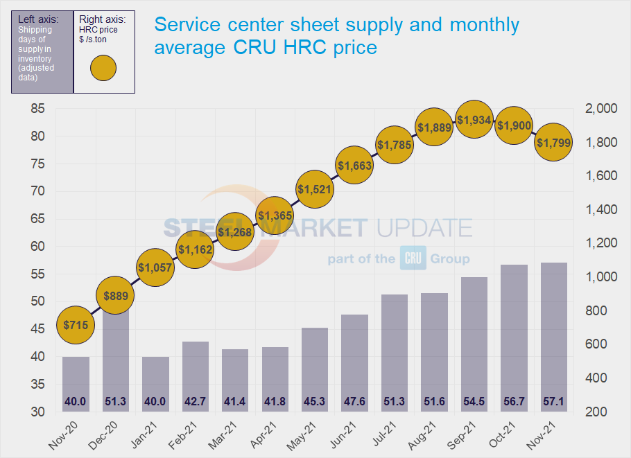 With one fewer shipping day in November and the Thanksgiving holiday, shipments dropped as expected, while inventory volumes were flat. With prices falling and the end of year approaching, service centers have been focused on bringing their inventory levels down.