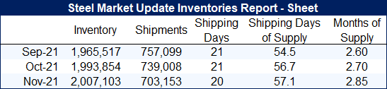 U.S. service center flat rolled inventories rose again in November, according to Steel Market Update data. At the end of November, service centers carried 57.1 shipping days of supply on an adjusted basis, compared to 56.7 shipping days of supply at the end of October. November had 20 shipping days, compared to 21 in October.